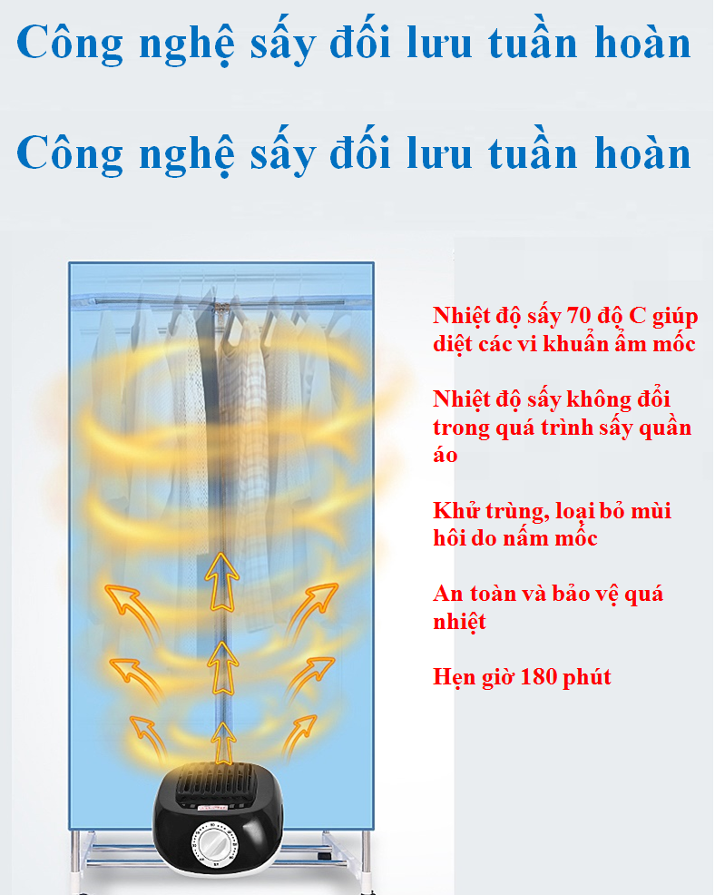 "Củ Sấy" ( Dàn phát nhiệt + Quạt gió) to. Công suất mạnh mẽ 1000W. Sử dụng công nghệ phát nhiệt ổn định PTC, Kết hợp các khe thổi gió dạng "lốc xoáy" giúp hơi nóng toả đều và luân chuyển đối lưu trong tủ. Quần áo khô nhanh hơn và Không bị nhăn, không có mùi hôi khó chịu. Tiện lợi mà lại Tiết kiệm điện, Tiết kiệm thời gian.